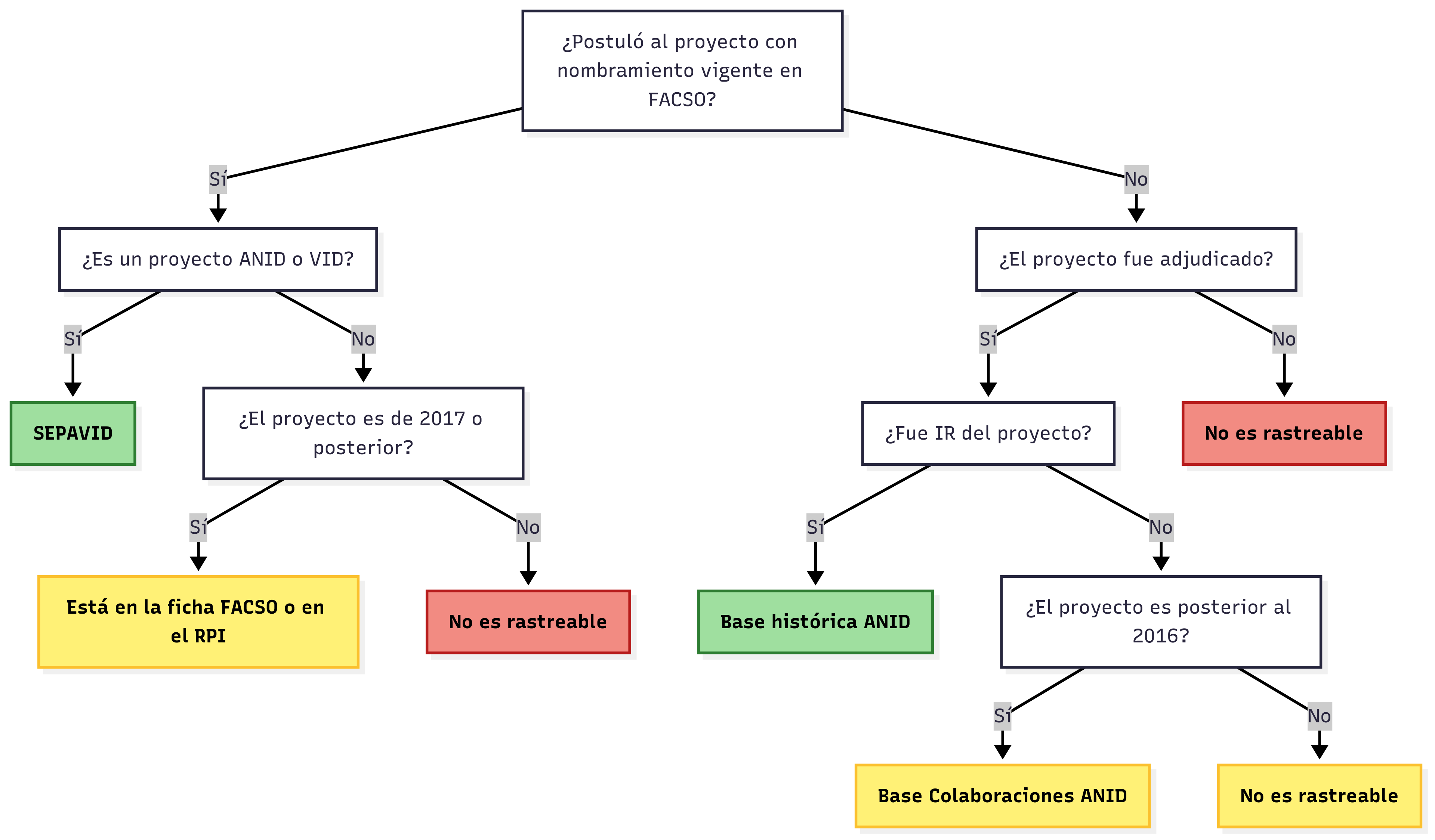 Construir una base integrada de proyectos de investigación – incluyendo proyectos adjudicados y no-adjudicados – que permita reconstruir las trayectorias de investigación de los académicos de la Facultad.